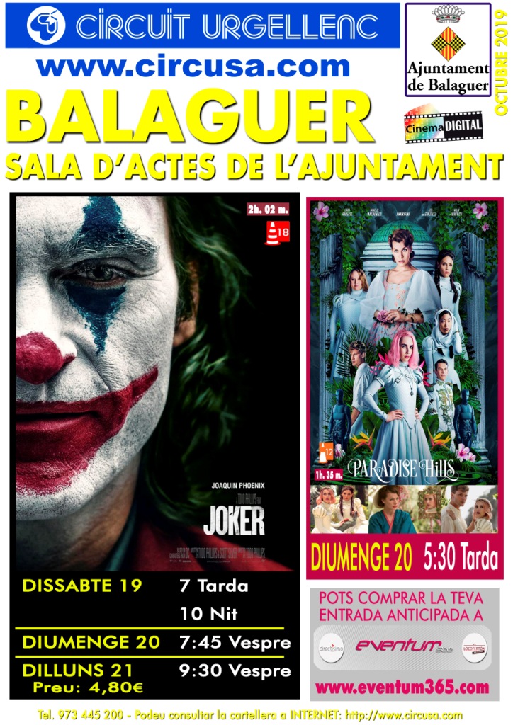 Aquest cap de setmana al Cinema Balaguer podreu veure dues grans pel-licules, 'JOCKER' i 'PARADISE HILLS'.