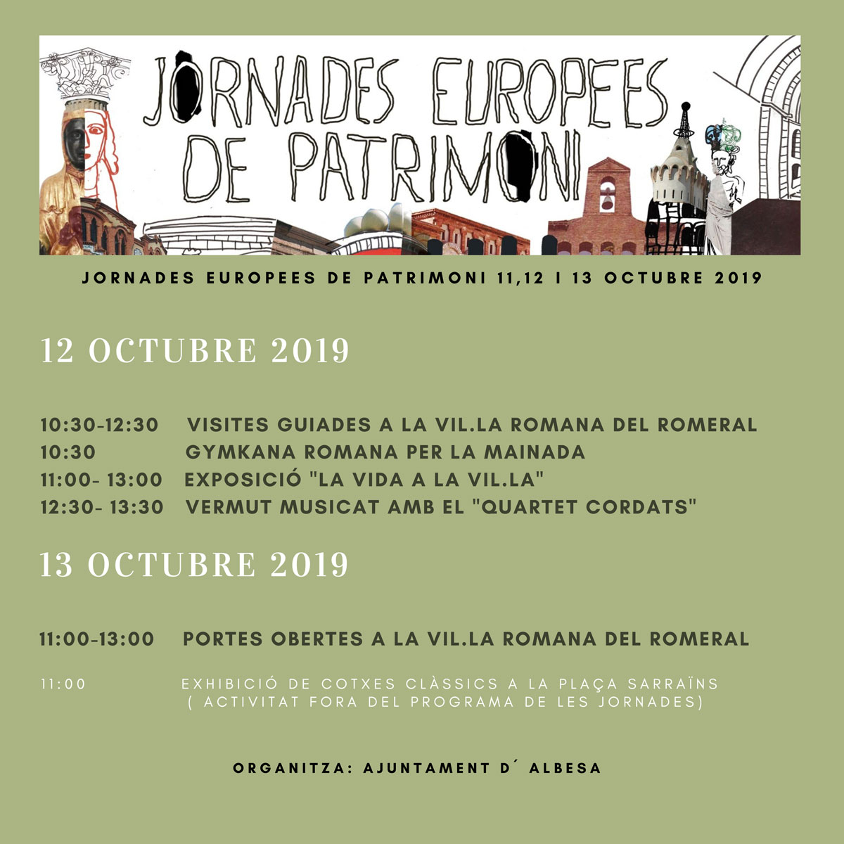 Un any més, Albesa es suma a la festa major del nostre patrimoni cultural, les Jornades Europees del Patrimoni. Per aquest cap de setmana s'han programat diverses activitats a la Vil·la Romana del Romeral.