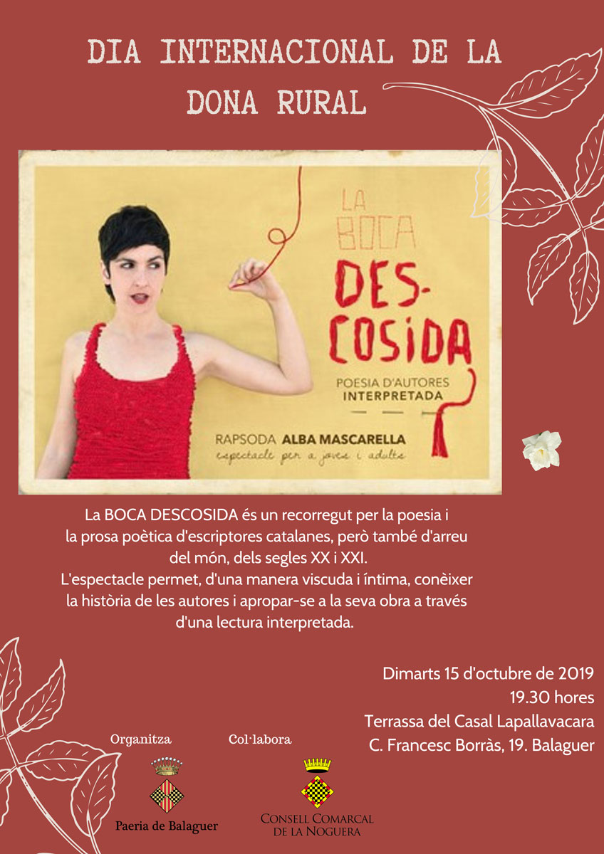 Balaguer commemorarà el proper 15 d'octubre el dia internacional de la dona rural amb la representació al casal Lapallavacara de l'espectacle poètic 'la boca descosida', a càrrec de Alba Mascarella.