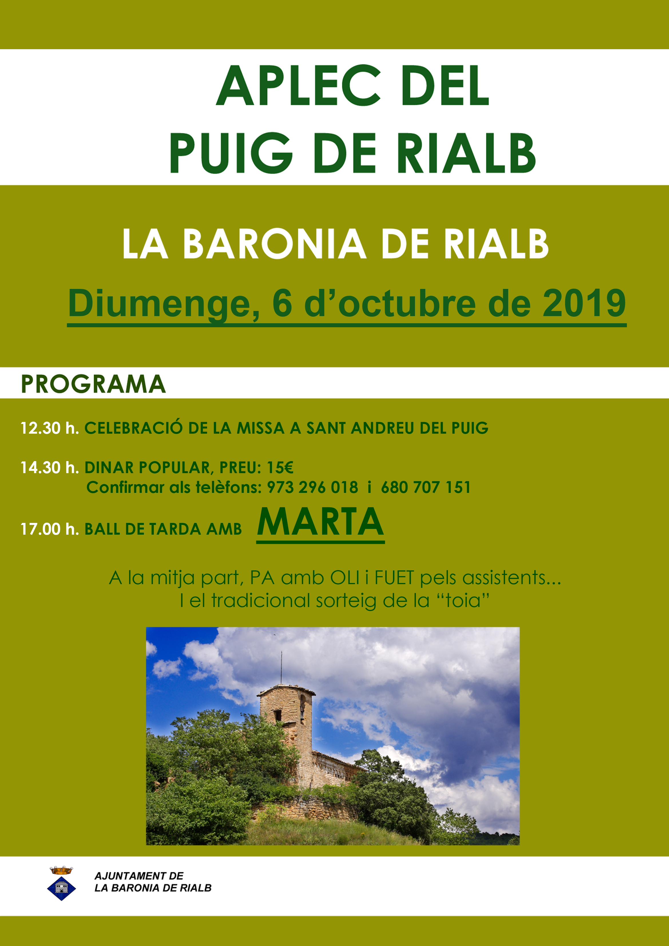 El proper diumenge 6 d'octubre tindrà lloc el tradicional Aplec del Puig, a La Baronia de Rialb. Comptarà amb dinar popular i un ball de tarda entre altres.