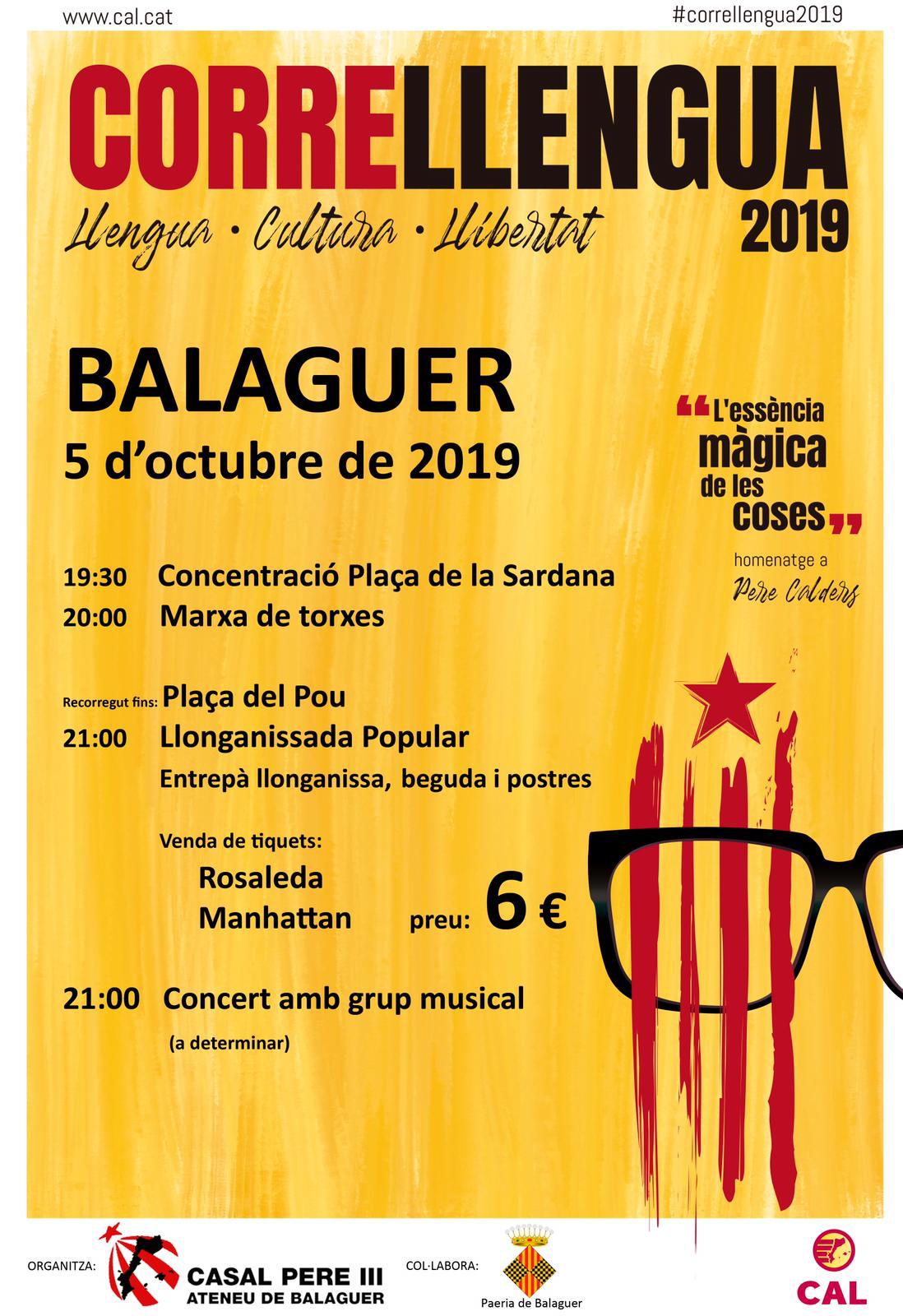 Balaguer celebrarà el dissabte dia 5 d'octubre el Correllengua 2019 recorda'n la figura del poeta i escriptor Pere Calders, i amb la lectura del manifest del Correllengua 2019 escrit per Jordi Cuixart president d'Òmnium