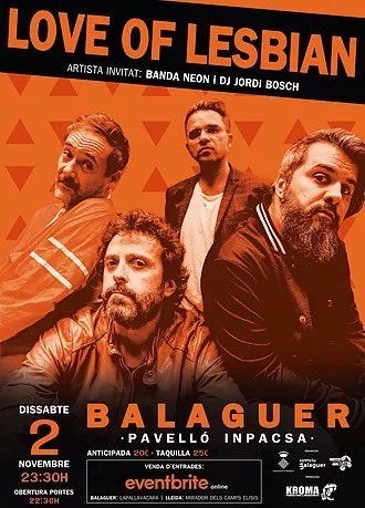 Comença la venda d'entrades al casal Lapallavacara per al concert que el grup Love of Lesbian farà a Balaguer el 2 de novembre com a prèvia a la Festa Major. Hi actuaran també Banda Neon i dj Jordi Bosch.
