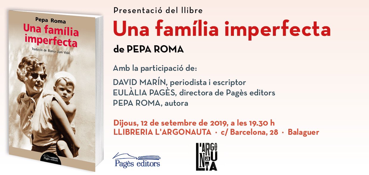 Avui dijous tindrà lloc la presentació del llibre 'Una família imperfecta' de Pepa Roma, a la llibreria l'Argonauta de Balaguer.
