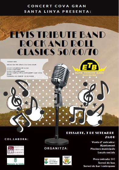 Aquest dissabte a la Cova Gran de Santa Linya s'hi fa el Concert Cova Gran. Aquest any hi actuarà Elvis Tribute Band, un grup de música Rock and Roll dels anys 50, 60 i 70.