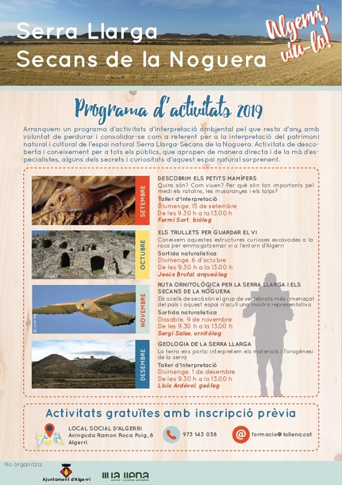 L'Ajuntament d'Algerri posa en marxa un programa d'activitats de descoberta a l'espai natural de la Serra Llarga-Secans de la Noguera. La primera activitat es farà el 15 de setembre i ja són obertes les inscripcions.