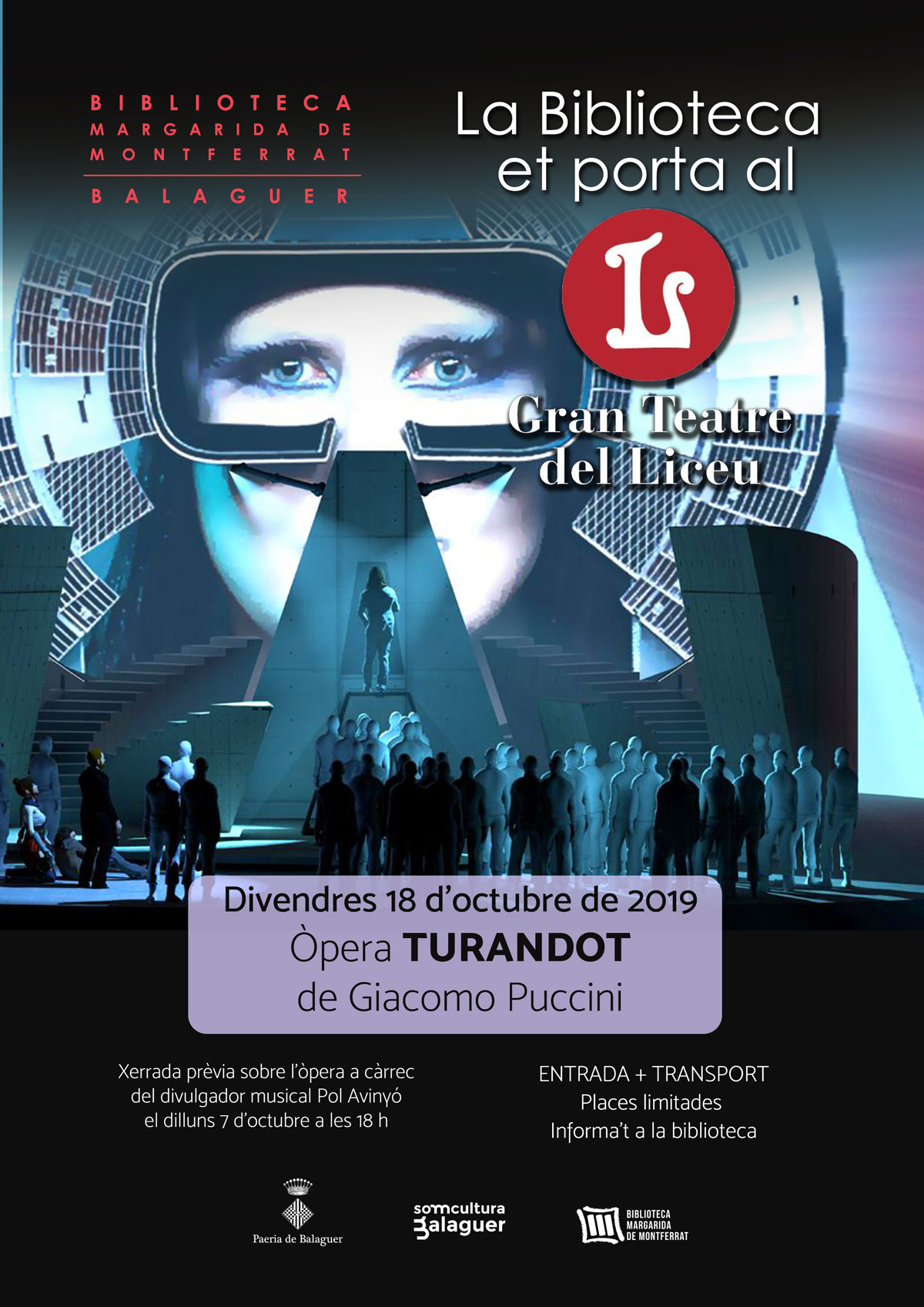 La Biblioteca Margarida de Montferrat de Balaguer organitza la quarta sortida al Liceu. Es farà el divendres 18 d'octubre i prèviament, el dilluns 7 d'octubre el divulgador musical del Liceu Pol Avinyó farà una xerrada per explicar l'òpera.