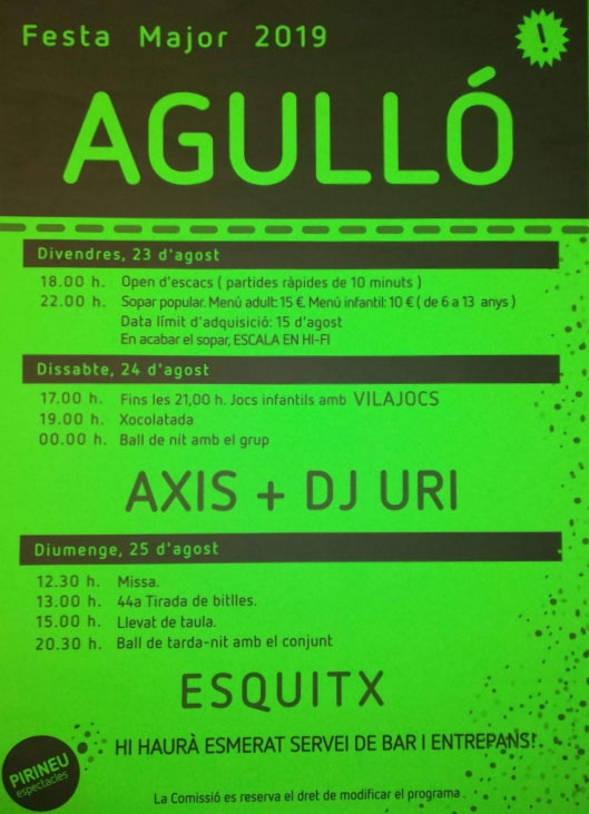 Agulló, entitat del municipi d'Àger celebra aquest cap de setmana la Festa Major amb un open d'escacs, sopar popular activitats per la mainada i ball i gresca a les nits.