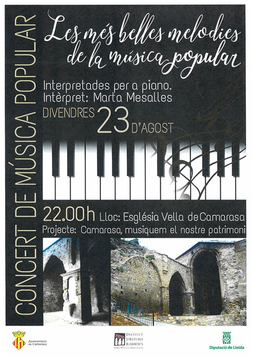 La pianista balaguerina Marta Mesalles serà la protagonista aquest divendres 23 d'agost d'un nou concert del cicle Camarasa, musiquem el nostre patrimoni. Ho farà amb el concert 'Les més belles melodies de la música popular'.