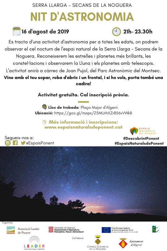 Espais Naturals de Ponent organitza una 'Nit d'astronomia a la Serra Llarga-Secans de la Noguera' aquest divendres a les 21h, als Espais Naturals de Ponent a Algerri