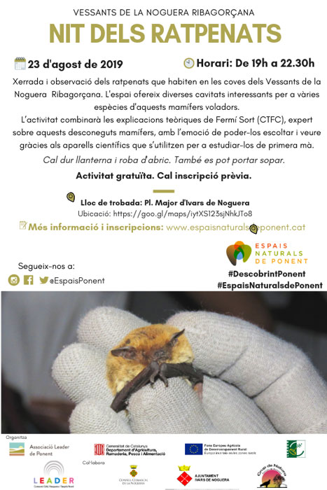 Espais Naturals de Ponent organitza la Nit dels ratpenats aquest divendres al municipi d'Ivars de Noguera. Es podran observar aquest animals que habiten a les coves dels vessants del riu Noguera Ribagorçana amb les explicacions d'un tècnic.