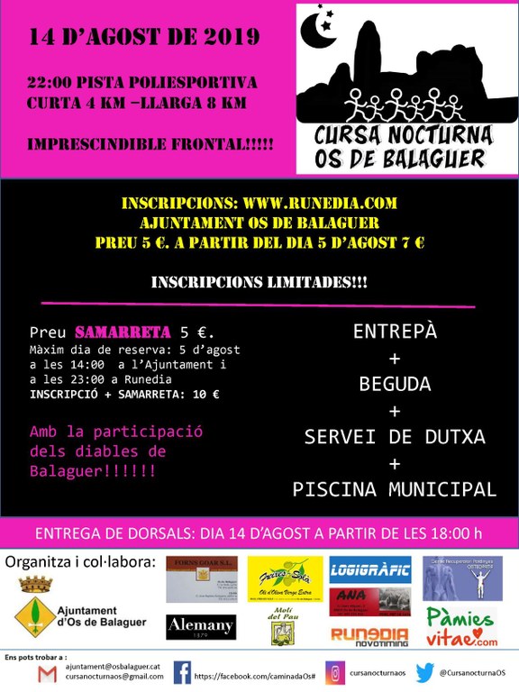 Aquest dimecres es celebrarà la 7a Cursa nocturna d'Os de Balaguer. Es tracta d'una prova que compta amb dos modalitats, de 4 i 8 km i amb l'al·licient d'haver-se de fer amb frontal en iniciar-se a les 10 del vespre.