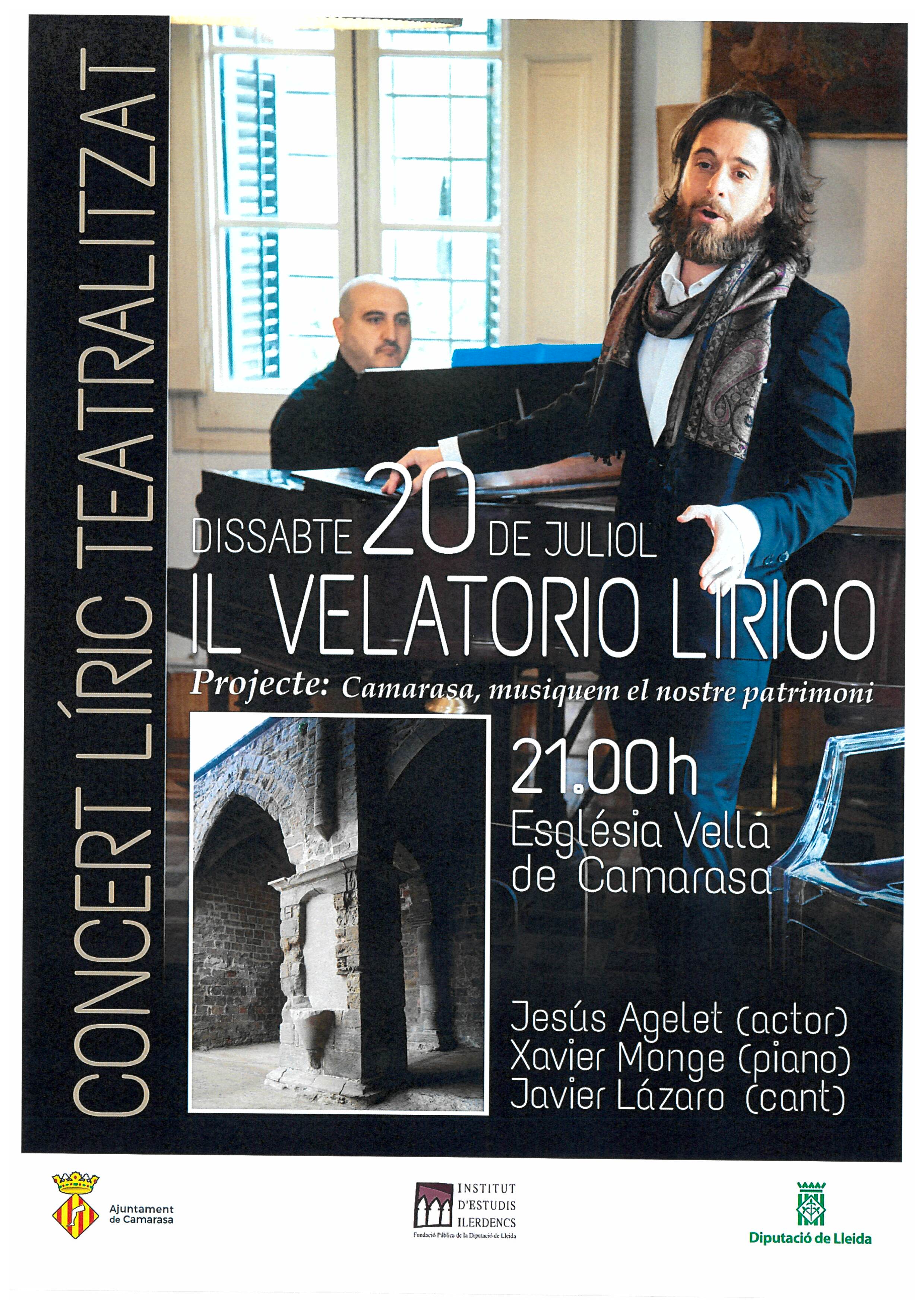 Camarasa acollirà aquest dissabte 20 de juliol el concert líric teatralitzat 'Il velatorio lirico', en el marc del projecte 'Camarasa, musiquem el nostre patrimoni'. Serà a càrrec de Jesús Agelet, Xavier Monge i Javier Lázaro.