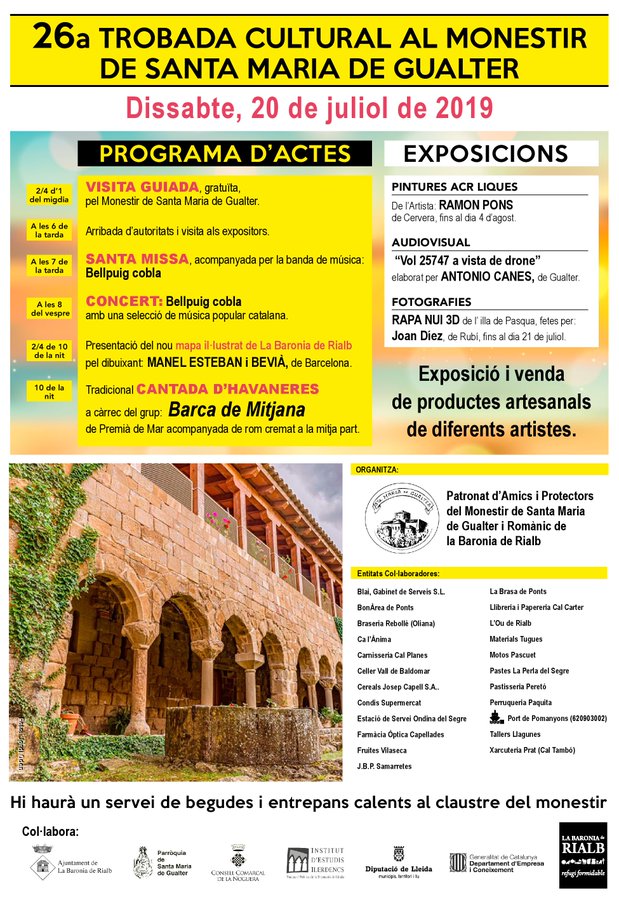 Aquest dissabte 20 de juliol tindrà lloc la Trobada Cultural al Monestir de Gualter, que enguany arriba a la 26a edició, i que té la Bellpuig Cobla i el grup d'havaneres Barca de Mitjana com a actuacions destacades.