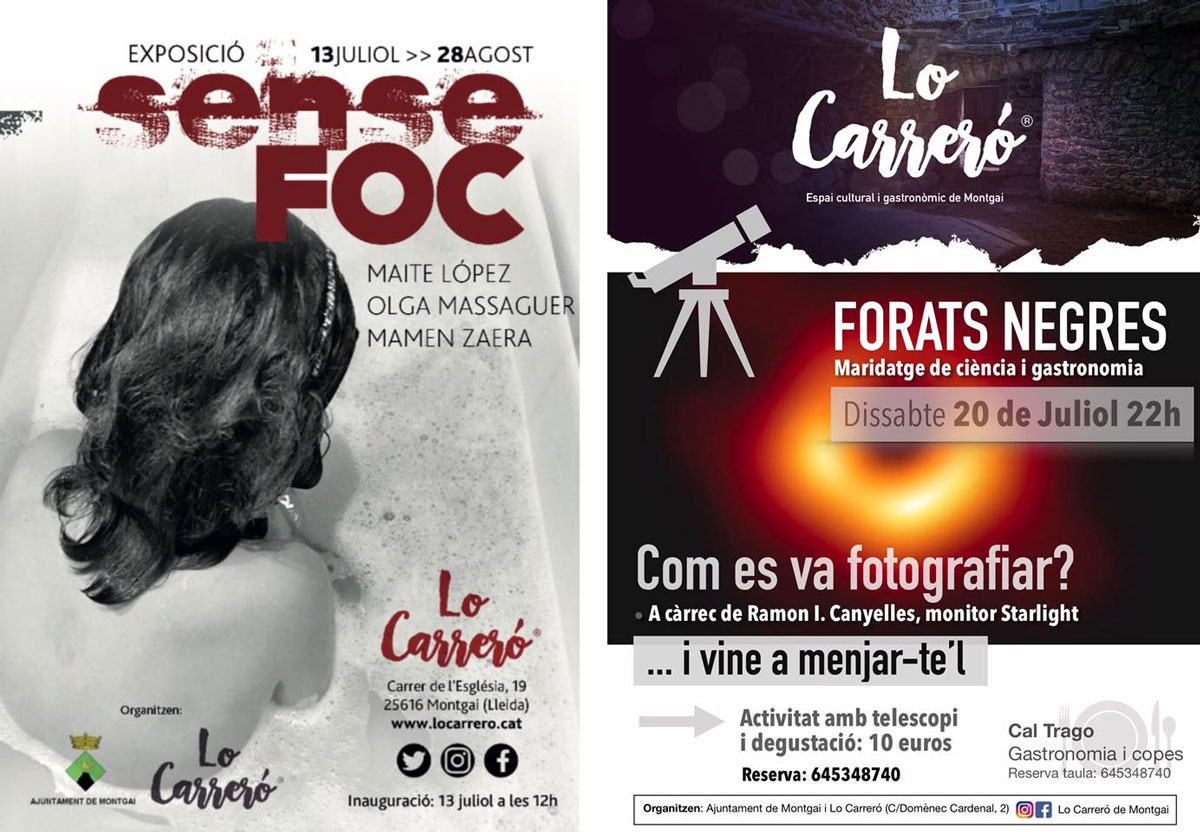 Lo Carreró de Montgai acull fins a finals de juliol l'exposició 'Sense foc', obra de tres artistes de Barcelona i que gira al voltant de tres elements, la terra, l'aigua i l'aire. A més, demà dissabte acollirà un maridatge de ciència i gastronomia