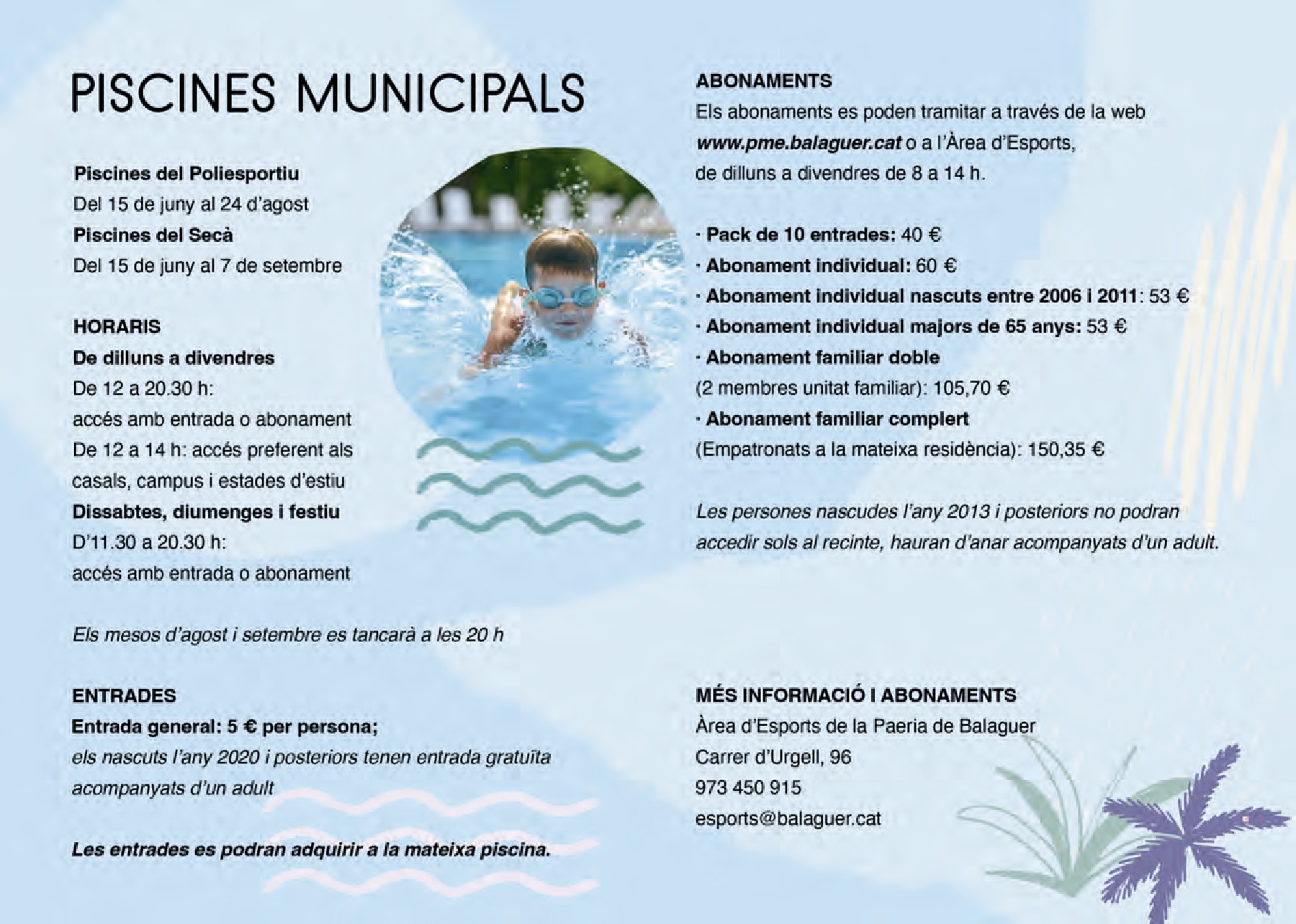 Una vintena de piscines municipals s'adhereixen al carnet Interpiscines de la Noguera. Hi permetrà l'accés gratuït als joves de la Noguera de 12 a 30 anys durant els mesos d'estiu