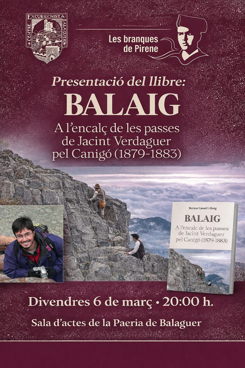 El Centre Excursionista de Balaguer organitza la presentació del llibre Balaig. A l’encalç de les passes de Jacint Verdaguer pel Canigó (1879-1883) (Verdaguer Edicions, 2025) a càrrec de l'autor, Bernat Gasull i Roig, el pròxim divendres, 6 de març, a les vuit del vespre (20:00 h), a la sala d’actes de la Paeria de Balaguer