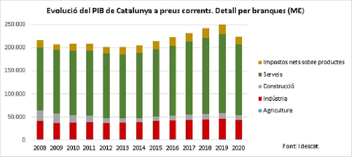 L'economia catalana cau un 11,5% anual el 2020, segons l'Idescat. L'evolució és cinc dècimes inferior a la de l'economia espanyola i està cinc punts per sota de la mitjana europea