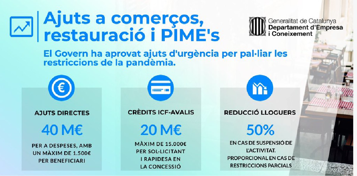 El Departament d'Empresa i Coneixement posarà en marxa en els propers dies una línia d'ajuts directes al sector de la restauració de 40 milions d'euros per compensar els sectors més afectats per les mesures restrictives sanitàries.