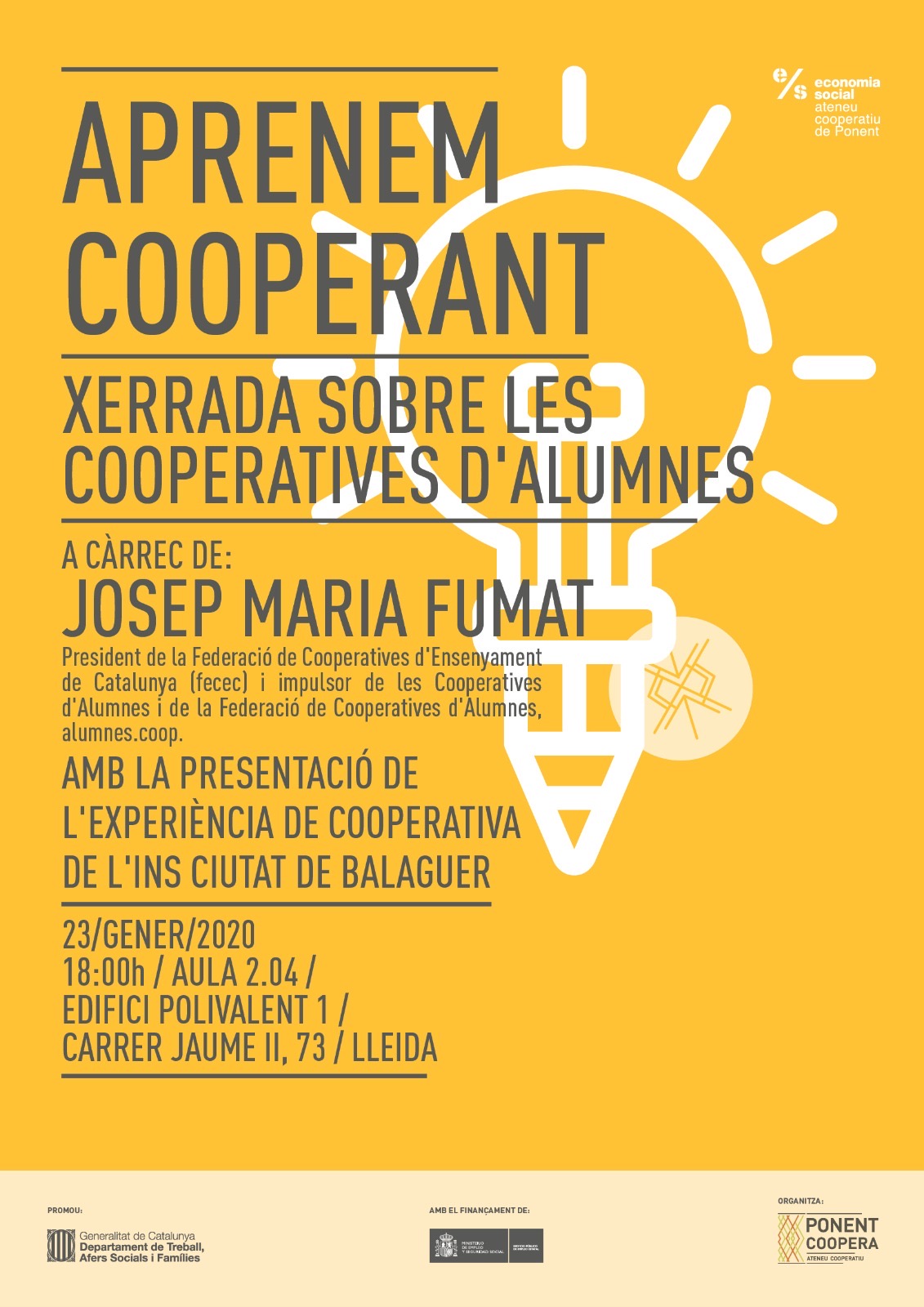 El proper dijous 23 de gener alumnes de l'INS Ciutat de Balaguer presentaran a Lleida la seva experiència de cooperativisme. Més de 2000 persones participen a les activitats organitzades per Ponent Coopera durant el 2019.