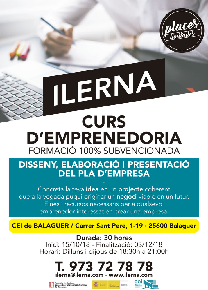El proper 15 d'octubre el reconegut centre de formació Ilerna impartirà al CEI Balaguer un curs, totalment gratuït adreçat a totes aquelles persones interessades en iniciar un projecte empresarial o un negoci