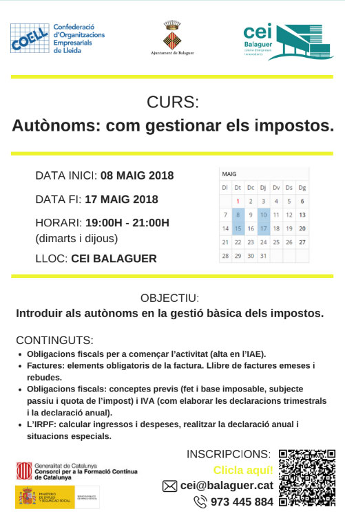 A partir del dia 8 de maig el CEI de Balaguer oferirà un curs de 8 hores de duració adreçat a conèixer com gestionar els impostos els autònoms.