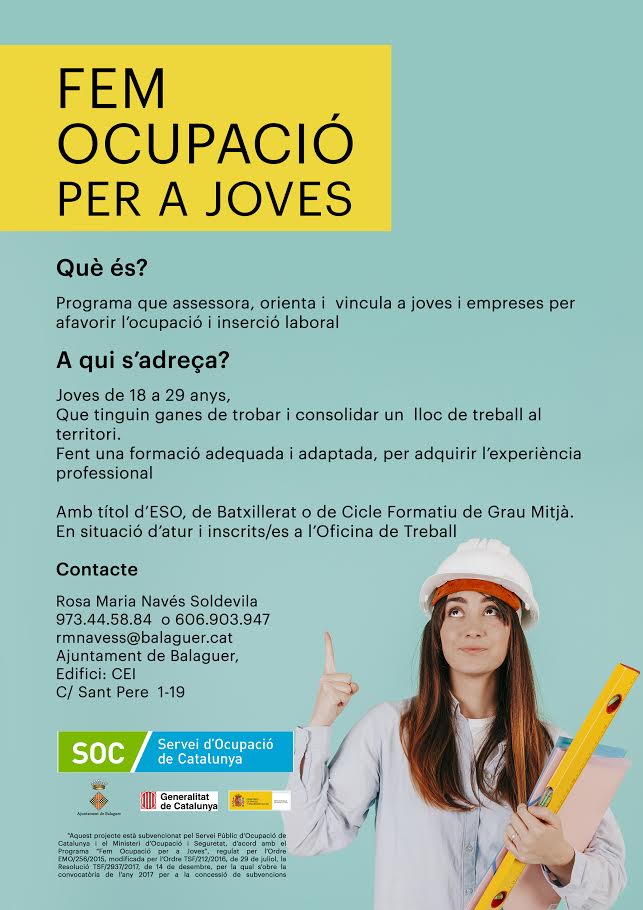 L'ajuntament de Balaguer desenvolupa novament el programa 'Fem ocupació per a joves' per potenciar l'ocupació de les persones joves i respondre a les necessitats de les empreses sobre demanda de personal.