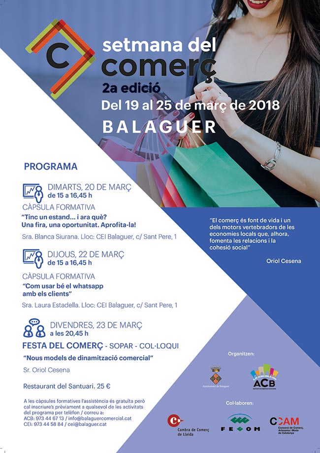 Una xerrada formativa sobre consells i propostes perquè els expositors treguin el màxim profit de la seva participació a les fires obre avui a Balaguer la Setmana del Comerç que se celebra arreu del país des d'avui fins diumenge. A la xerrada de demà hi