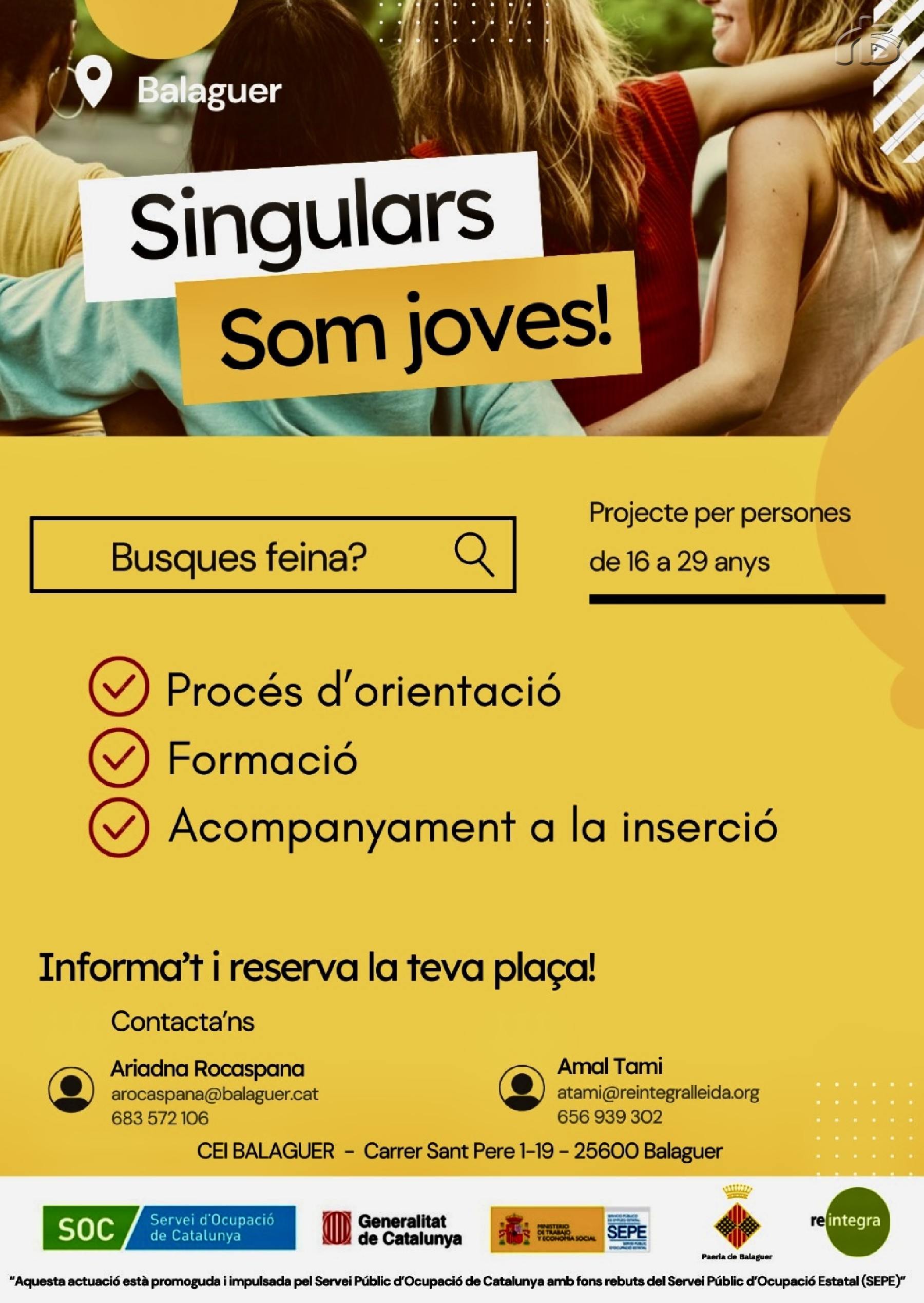 La Paeria de Balaguer i l'Associació Reintegra fan una crida perquè els joves de 16 a 29 anys que busquen feina se sumin al projecte Singulars, en el qual es treballa l'orientació i la formació per facilitar la inserció laboral