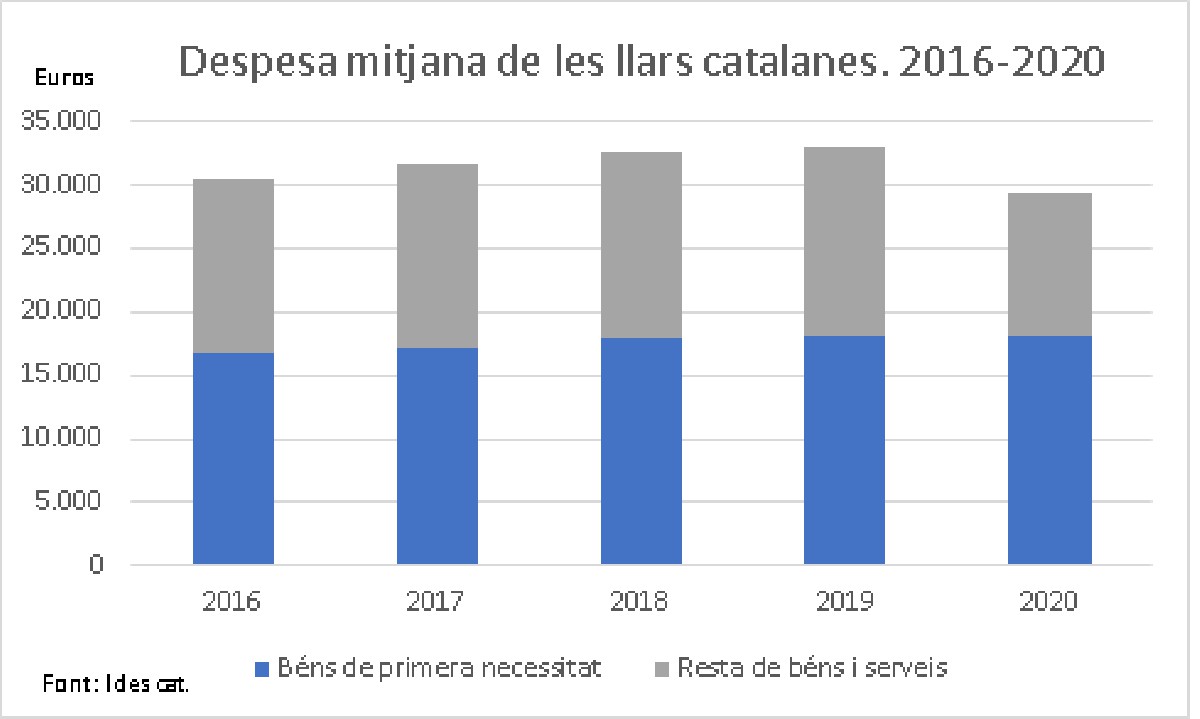 L'any 2020 la despesa mitjana de les llars catalanes en béns de primera necessitat s'ha mantingut estable, mentre que en la resta de béns i serveis ha disminuït un 24,8%