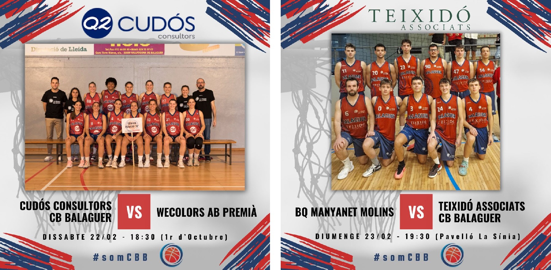 El Q2 Consultors, del Club Bàsquet Balaguer, rep aquest dissabte a 2/4 de 7 de la tarda al Premià. El Teixidó Associats haurà d'anar a jugar el diumenge a la tarda a la pista del Manyanet Molins