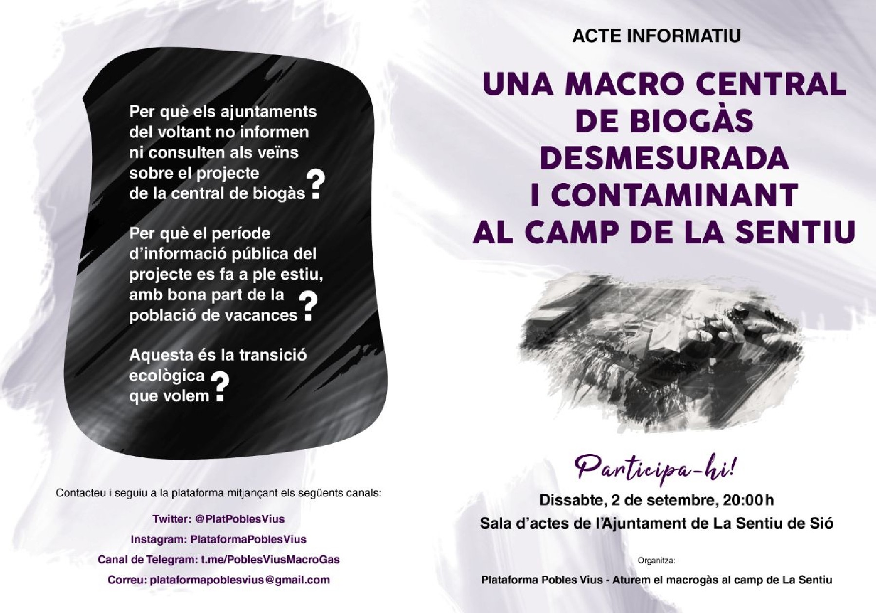 La Plataforma Pobles Vius convoca un acte informatiu a La Sentiu de Sió per parlar sobre la planta de biogàs que es preveu implantar al municipi. Segons el col·lectiu, es tracta d'un projecte desmesurat i contaminant