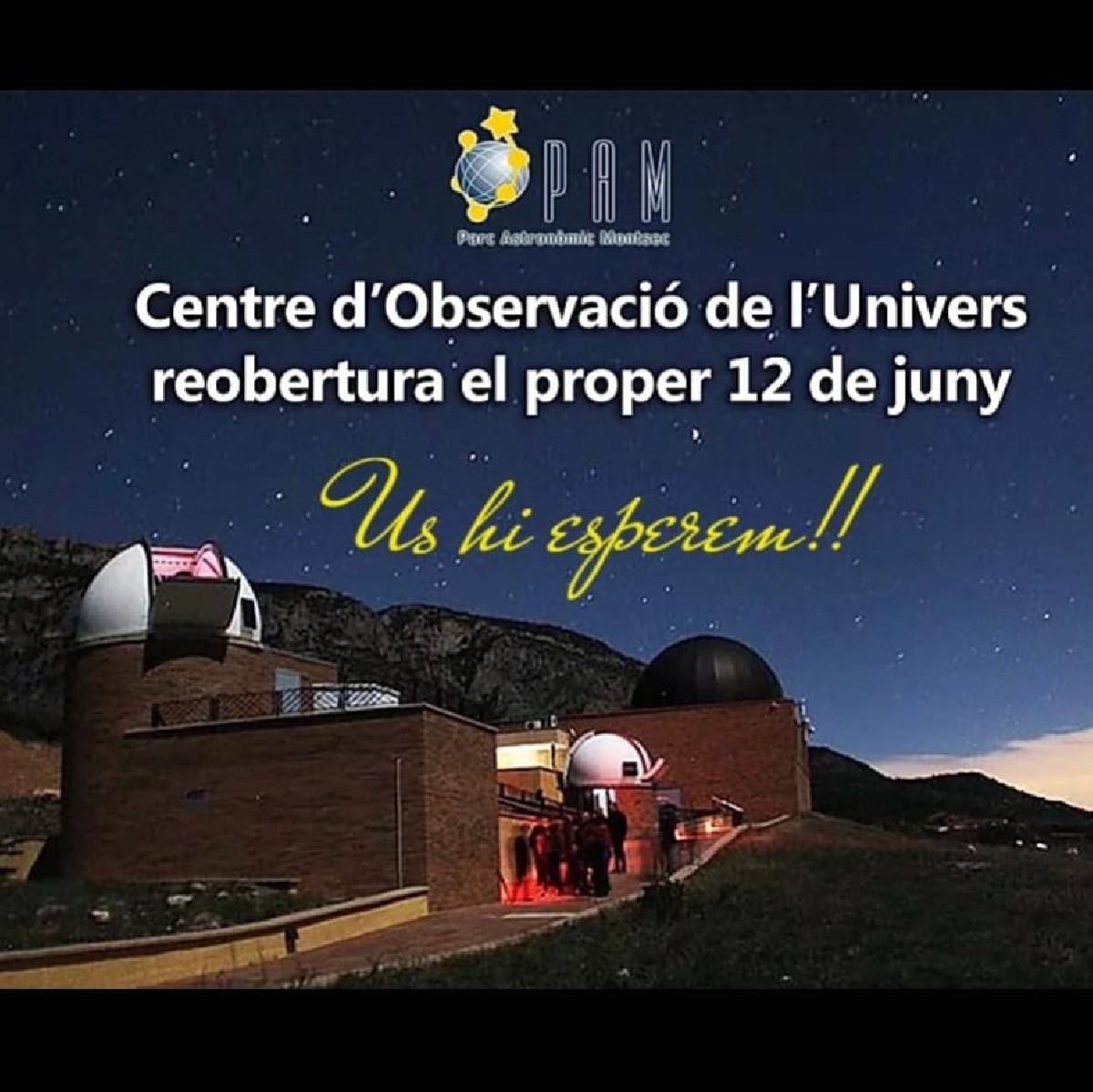 El proper divendres 12 de juny es reobrirà el Centre Astronòmic del Montsec. Ho farà amb les habituals visites tant diürnes com nocturnes, tot i que extremant les mesures de seguretat.