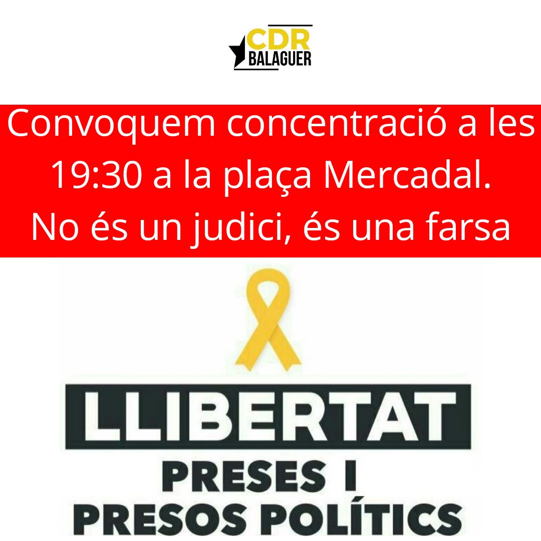 El CDR Balaguer es suma a les diverses concentracions previstes per aquesta tarda a les capitals de comarca. Convoca a la Plaça Mercadal, a les 19.30h i sota el lema 'No és un judici, és una farsa'