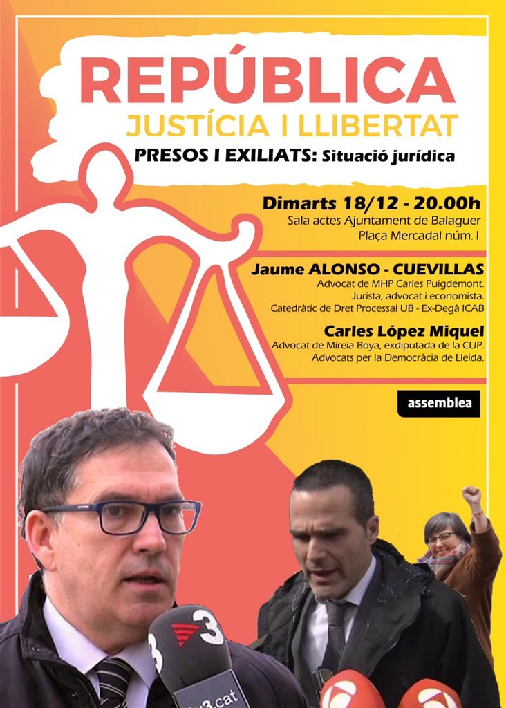 Els advocats Jaume Alonso-Cuevillas i Carles López Miquel seran el proper dimarts 18 de desembre a Balaguer per parlar de la situació jurídica dels presos i exiliats
