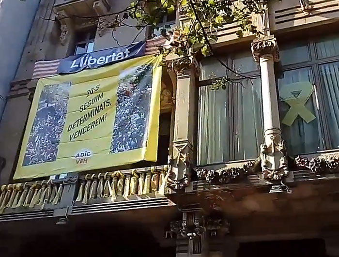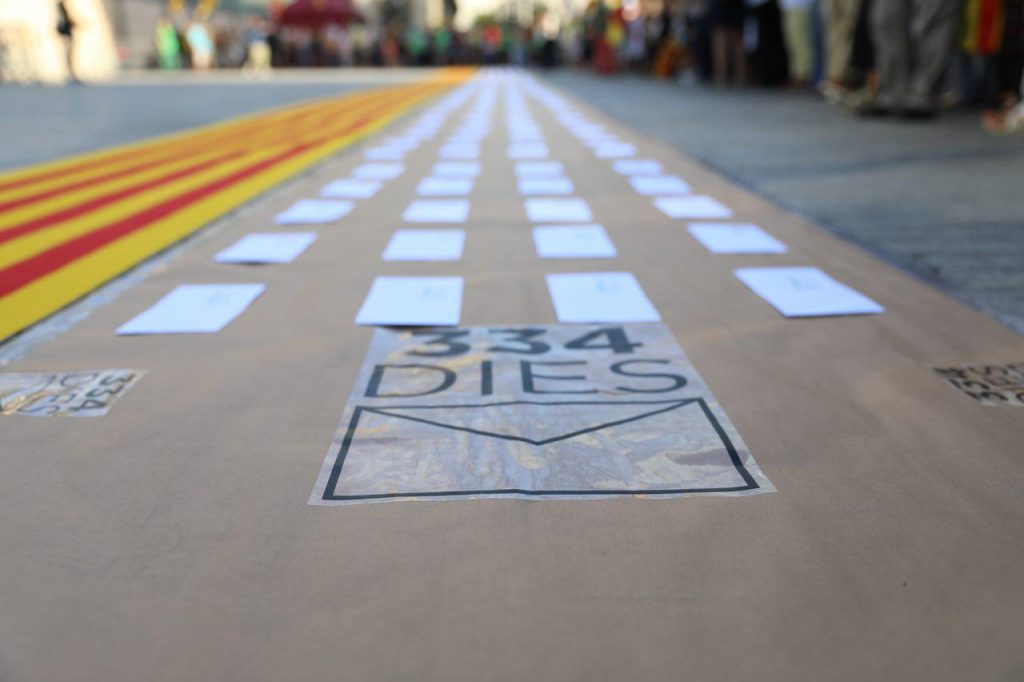 Dues pancartes i llaços grocs recorden al Departament d'economia el registre i les concentracions de fa un any. Els ciutadans poden deixar escrits els seus 'pensaments' en dos murals