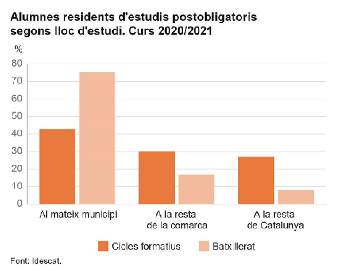 El 75,1% d'alumnes de batxillerat estudiaven al municipi on residien el curs 2020-21 però només el 42,8% dels d'FP. El 27,2% dels estudiants de cicles formatius marxen de la seva comarca