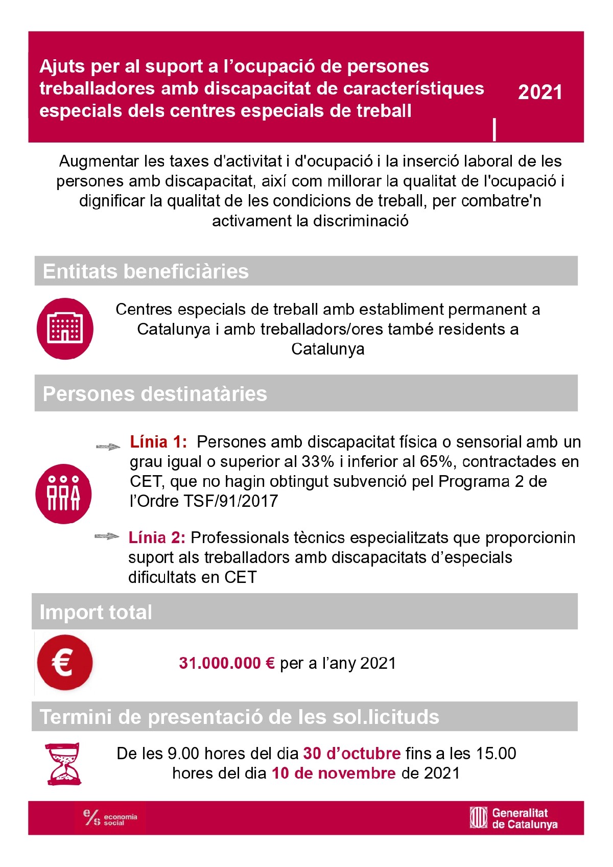 Empresa i Treball obre una nova convocatòria de subvencions per 31 milions d'euros destinats als centres especials de treball. El Departament haurà destinat enguany 104.838.000 euros en ajuts per donar suport a l'ocupació i fomentar la integració laboral
