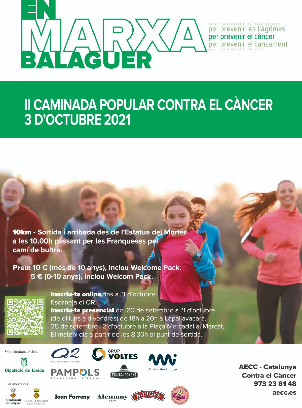 El proper diumenge dia 3 d'octubre torna la II Caminada contra el Càncer a Balaguer. Des de l'associació s'ha fet una crida a la participació en la caminada per recaptar diners però també per donar a conèixer la malaltia