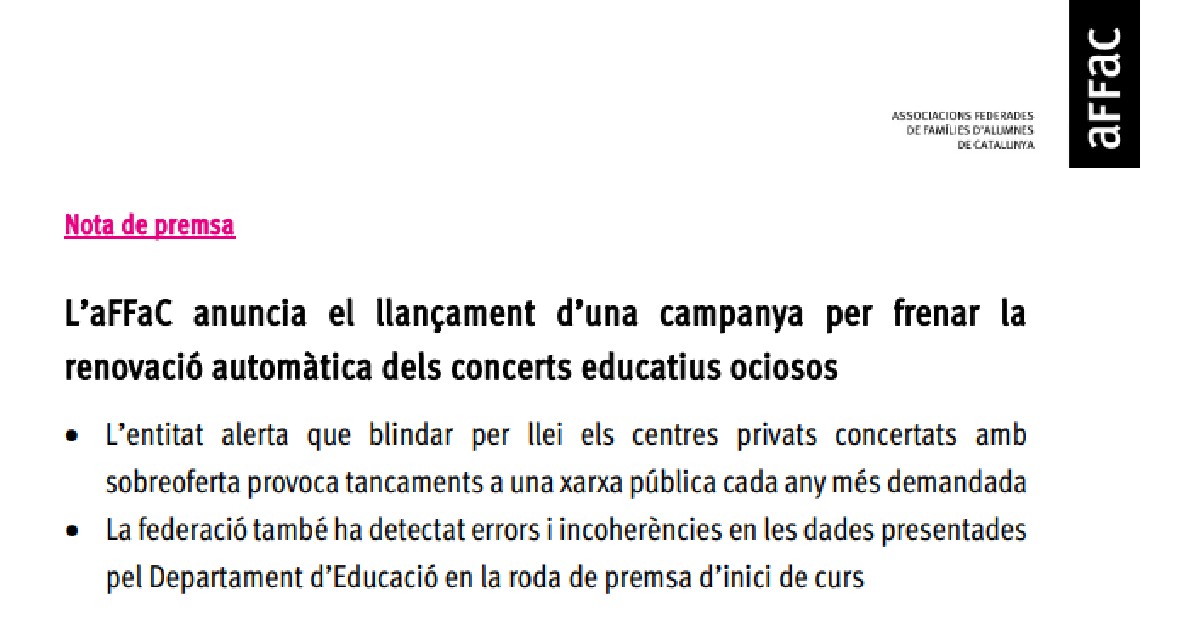L'aFFaC demana revisar l'ús de les mascaretes a les escoles per l''impacte en l'aprenentatge' i en la 'salut emocional'. L'aFFaC insta Educació a no renovar els concerts als centres amb sobreoferta i xifra en 16.000 les places sobrants