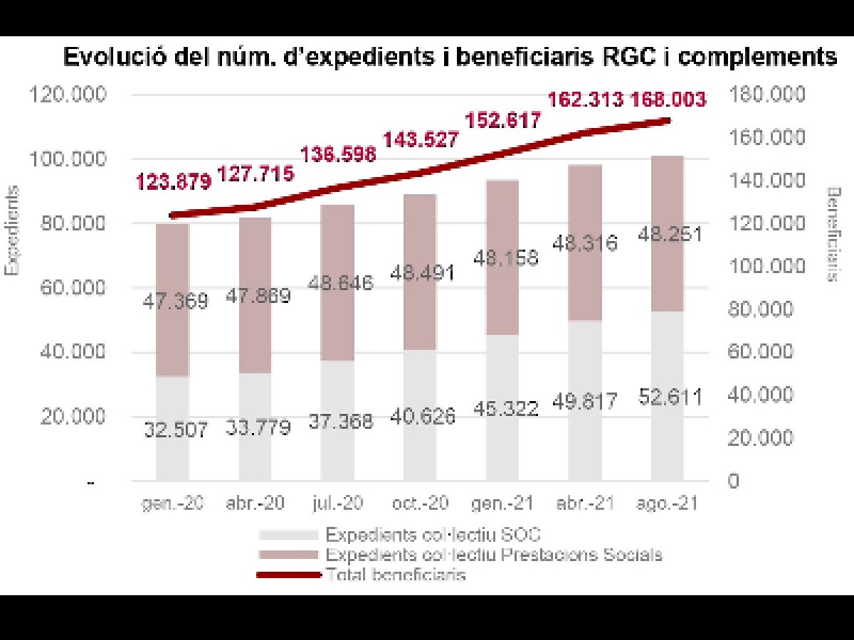 Unes 168.000 persones es beneficien de la Renda Garantida de Ciutadania, un 22,5% més que fa un any. Des de l'inici de la pandèmia de la covid-19, la prestació arriba a 41.500 persones més