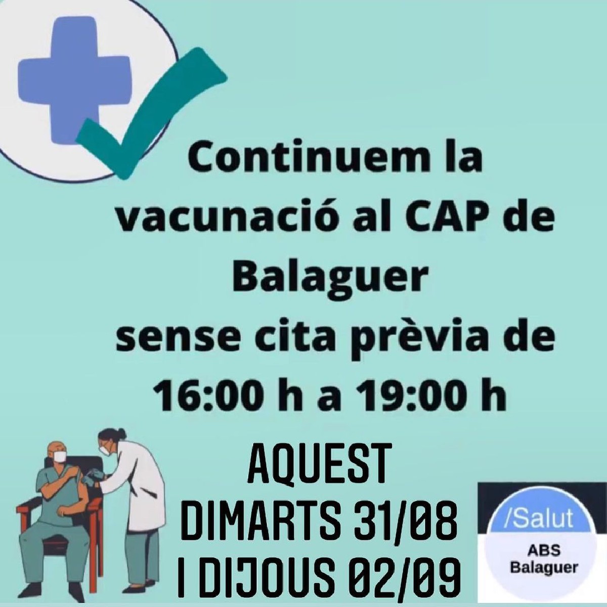 Continua la vacunació a Balaguer. Aquest dimarts i dijous s'administrarà de 4 a 7 de la tarda la vacuna de Pfzer al Cap de Balaguer i també dijous dia 2 al Casal Lapallavacara . Des del Cap es fa una crida a vacunar-se abans de l'inici del curs escolar