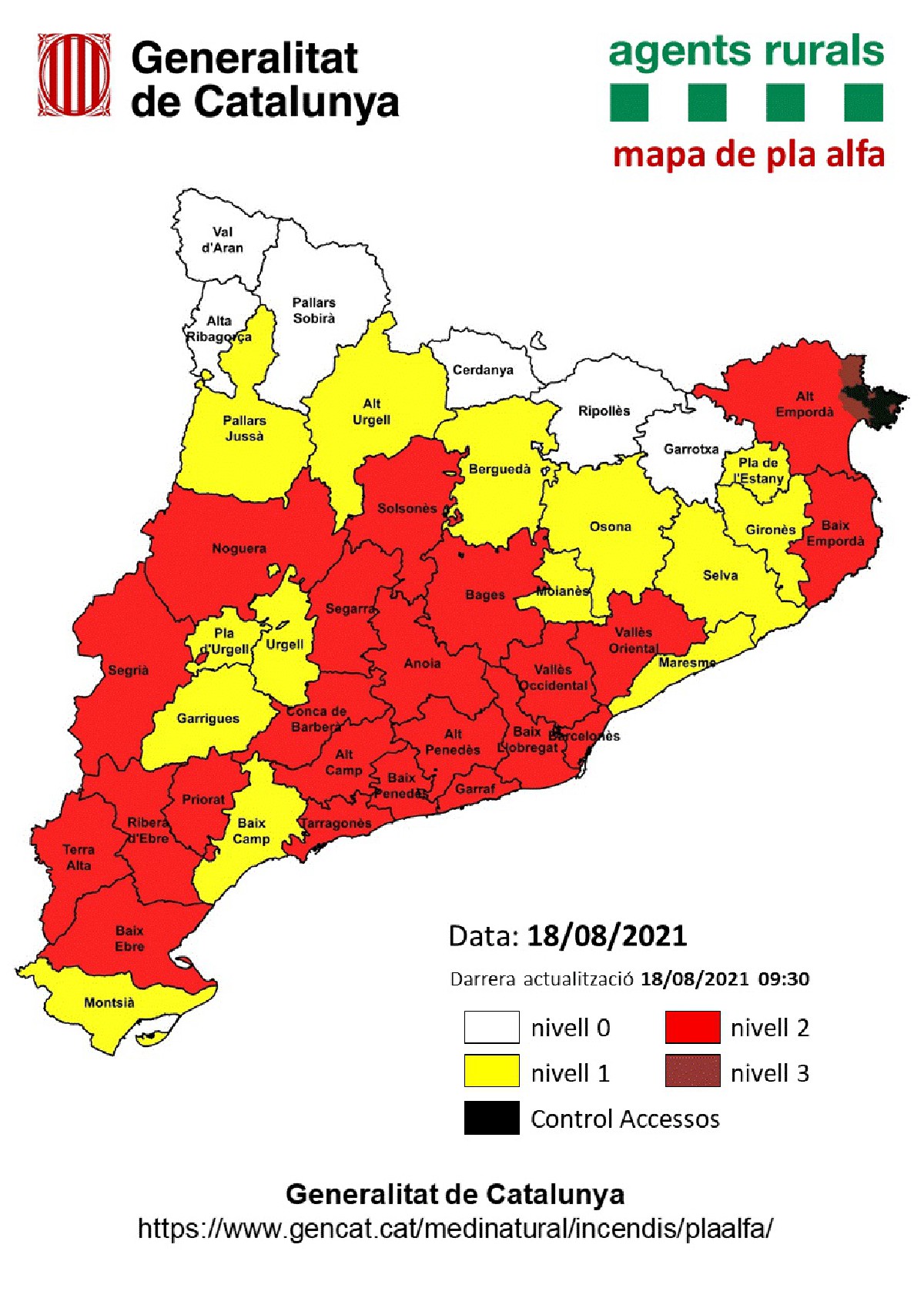 Interior prorroga fins dimecres les restriccions al medi natural per l'alt risc d'incendi. Es manté la suspensió d'acampades i rutes de lleure juvenil i l'esport a la natura i la restricció de treballs agrícoles