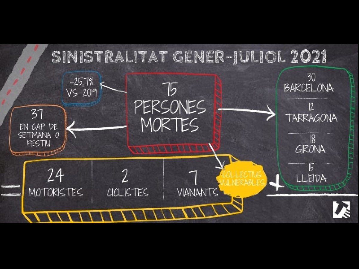 Balanç de la sinistralitat a les carreteres catalanes fins al 31 de juliol. 75 persones han mort a les carreteres catalanes en aquests set mesos. Gairebé el 45% dels morts d'aquest 2021 són de col·lectius vulnerables, 24 dels quals motoristes