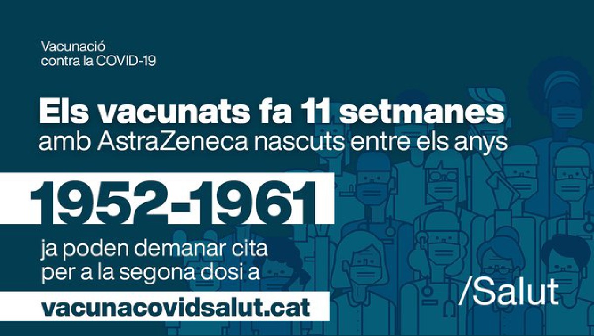 Salut ja dona cita per a la segona dosi d'Astrazeneca a les persones d'entre 60 i 69 anys. Aquest grup d'edat va rebre la primera dosi fa més d'11 setmanes