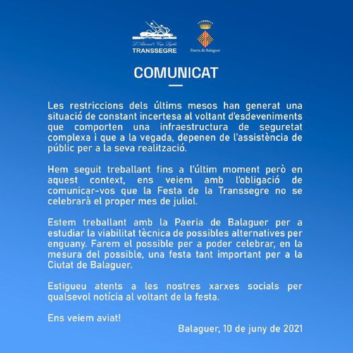 L'organització de la Transsegre informa mitjançant un comunicat que el proper mes de juliol no se celebrarà la tradicional festa i que ara treballa, tal que com va avançar Ràdio Balaguer, en una festa alternativa per aquest mateix estiu