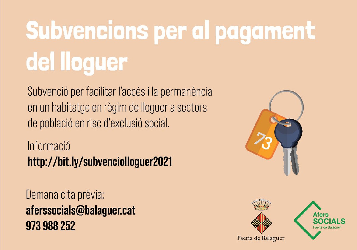 La Paeria de Balaguer informa que s'obre el termini per demanar les subvencions per al pagament del lloguer. Es tracta d'unes ajudes de la Generalitat i les sol·licituds es poden tramitar des de l'oficina d'Afers Socials de la carretera de Camarasa