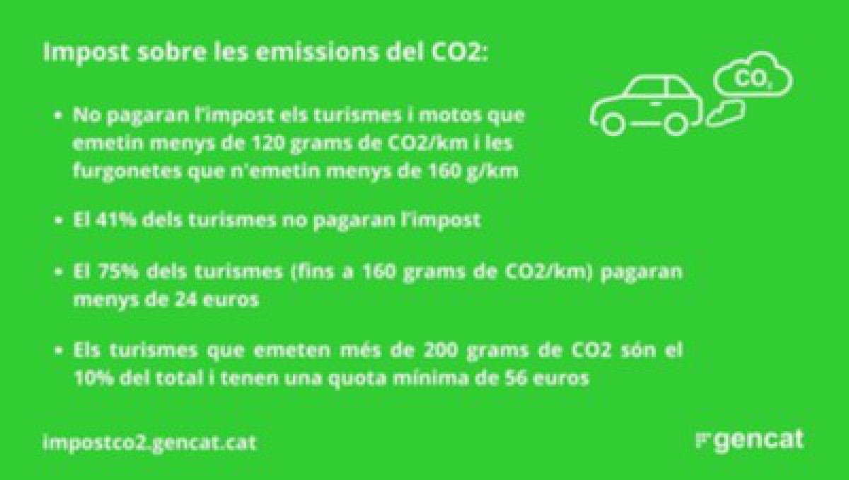 La Generalitat espera recaptar 212,3 MEUR durant els dos pròxims anys amb l'impost d'emissions de CO2. La mesura afectarà vora 2,3 milions de vehicles. Entre l'1 i el 15 de maig els contribuents podran consultar es si l'impost els afecta