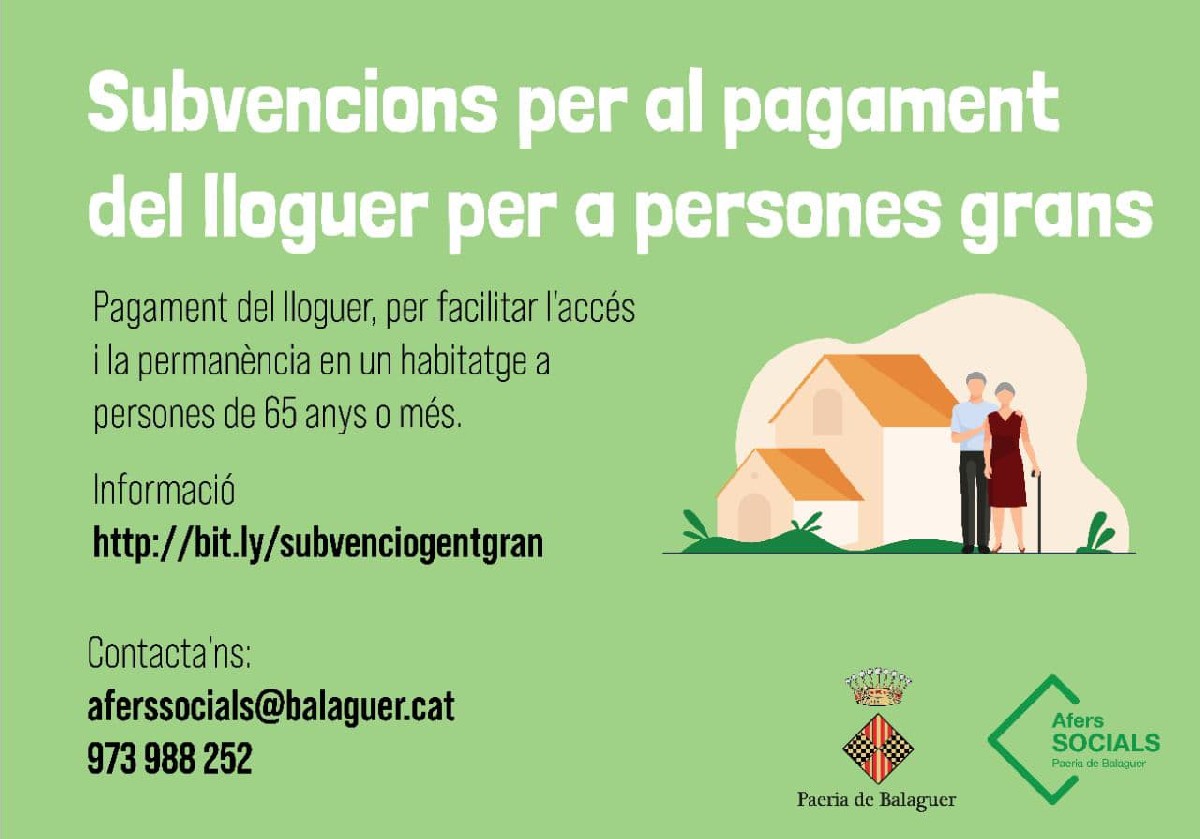 La Paeria de Balaguer informa que s'obre el termini per demanar les subvencions per al pagament del lloguer per a persones grans. Es tracta d'unes ajudes de la Generalitat i les sol·licituds es poden tramitar des de l'oficina d'Afers Socials