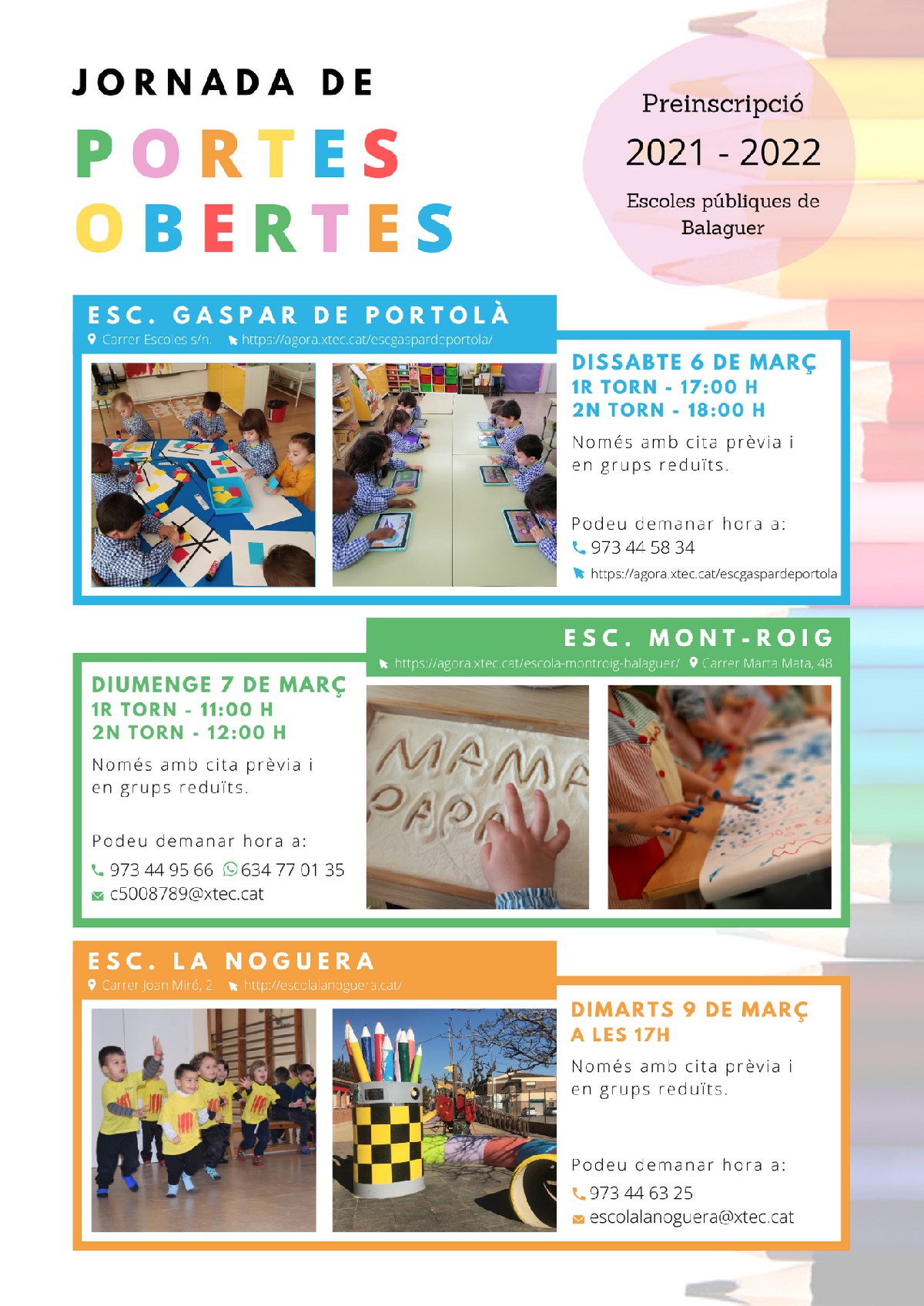 Els centres escolars de Balaguer preparen les jornades de portes obertes, que en el cas dels de primària es faran del 6 al 9 de març i amb mesures Covid. Les llars d'infants les duran a terme més endavant