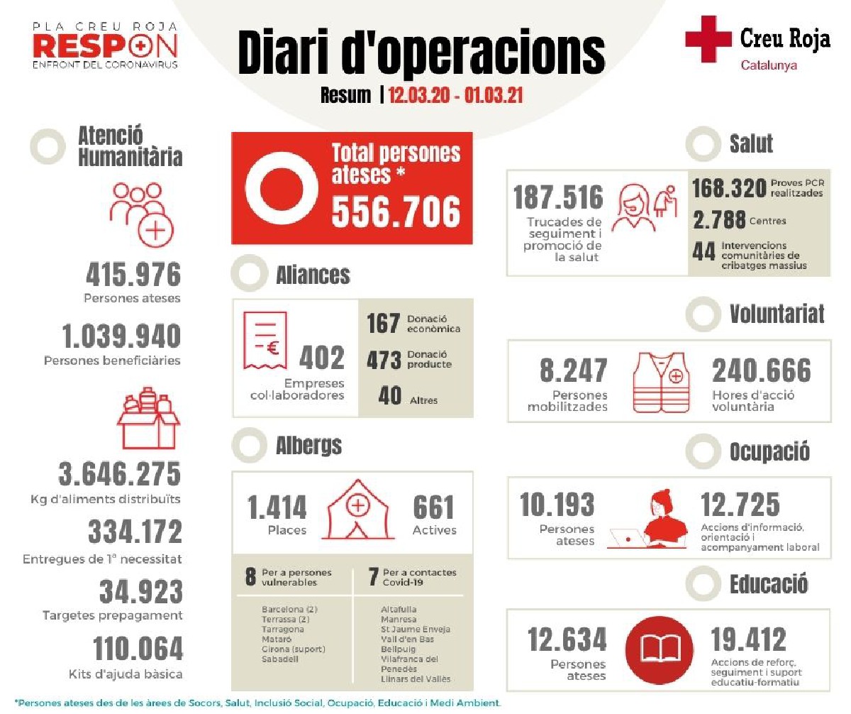 Creu Roja calcula que 1,4 milions de persones han rebut ajuda humanitària directa o indirectament durant la pandèmia. L'entitat va viure el pic de noves atencions el maig del 2020, amb un increment del 279% respecte al 2019